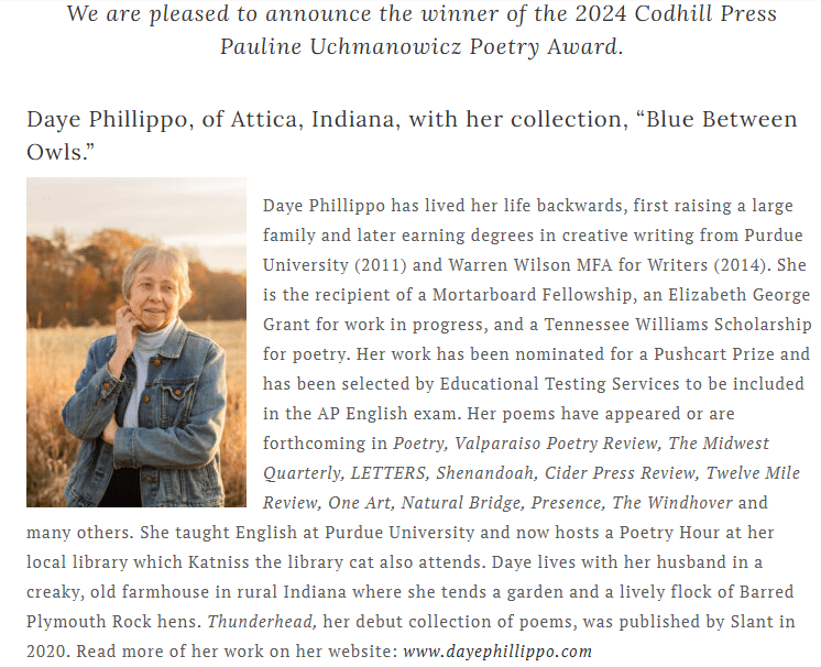 “Daye Phillippo’s lovely sharp-eyed Thunderhead begins with cold and ache from the Ice Age via the River Teays, miles beneath her farmhouse, tapped to drink and to cleanse. But this poet is haunted throughout by the unseen and the clear: seasons, work, family, the mysteries of the natural world here, then not.” –MARIANNE BORUCH, Professor Emeritus of English, Purdue University